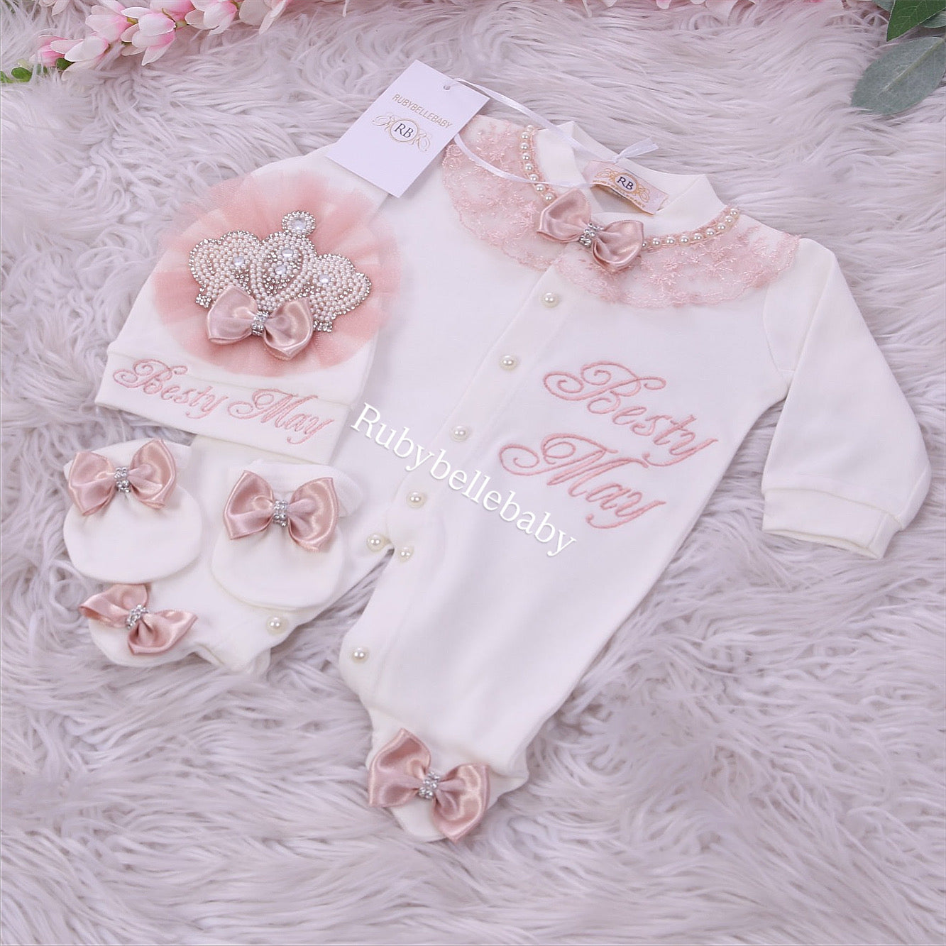 The arrival of your newborn is the most beautiful moment, make it more memorable with our 100% organic cotton handmade set. This set is the most perfect baby shower gift, Christening or home going outfit for your loved baby. It is embellished with high quality rhinestones, pearls, satin etc.