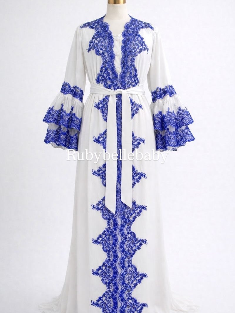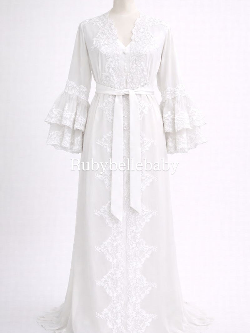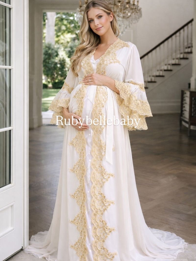Perfect for the hospital stay, postpartum recovery, newborn photos, and those first precious days with your baby, this robe features a soft flowing silhouette with elegant lace and embroidery details.