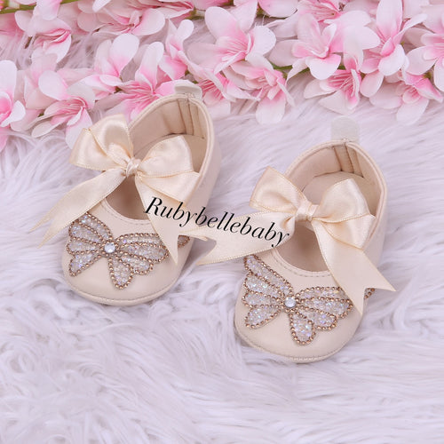 Baby Girl Butterfly Crystal Shoes with Satin Bow - Ivory/Cream