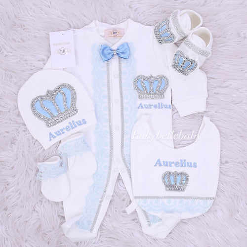10pc HRH Crown Bling Baby Boy Set - Light Blue/Silver
