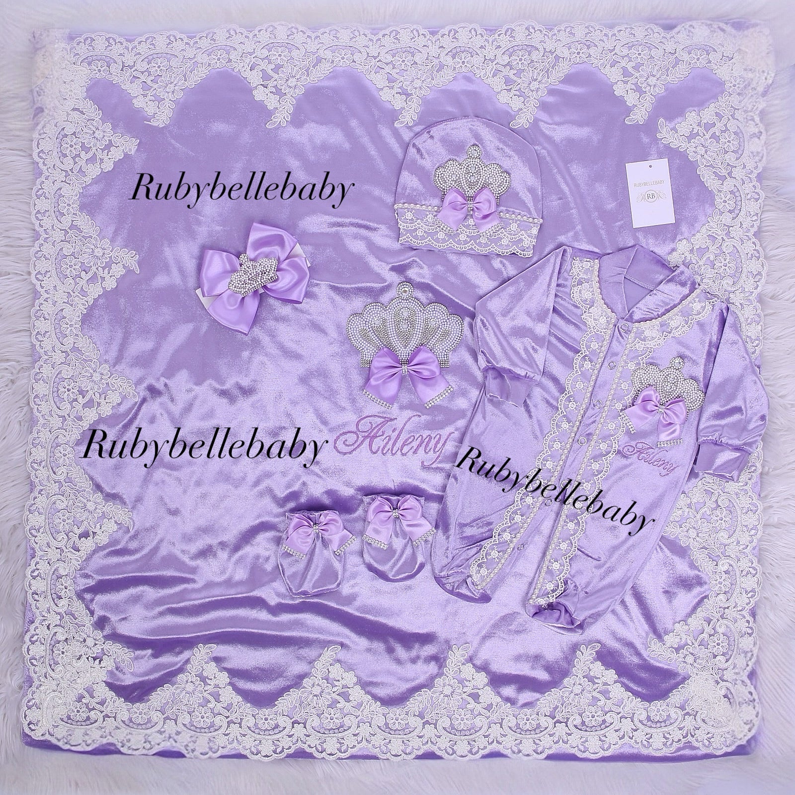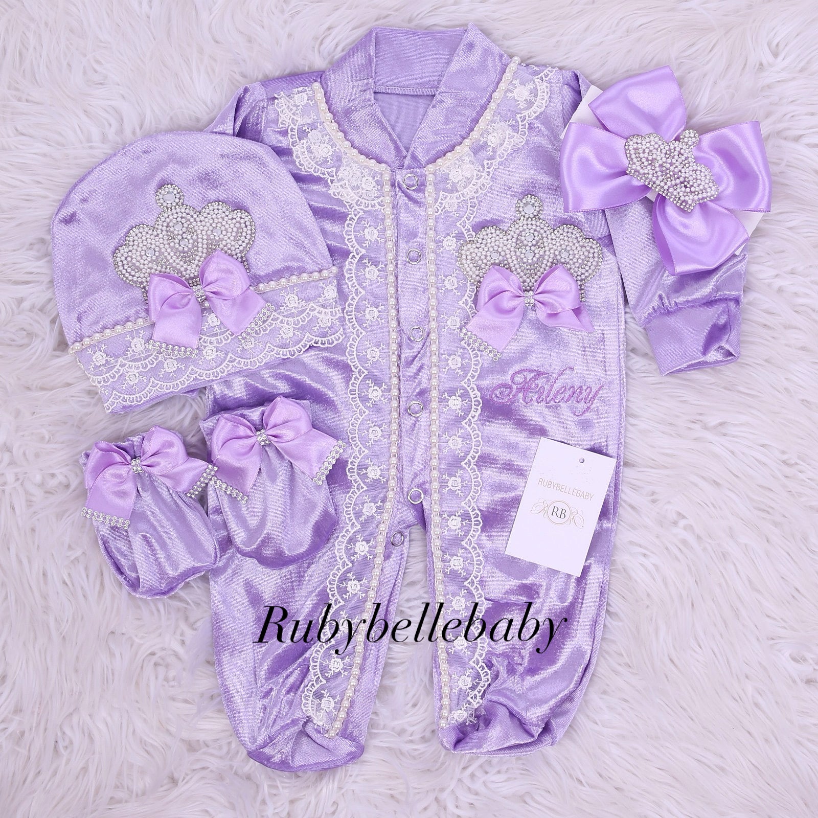Give your newborn the royal welcome she deserves with our 5pcs Jewel Crown Set in Lilac. This deluxe 5-piece set is crafted from ultra-soft lavender velvet and adorned with delicate white lace, shimmering pearls, and sparkling rhinestone crown appliqués.