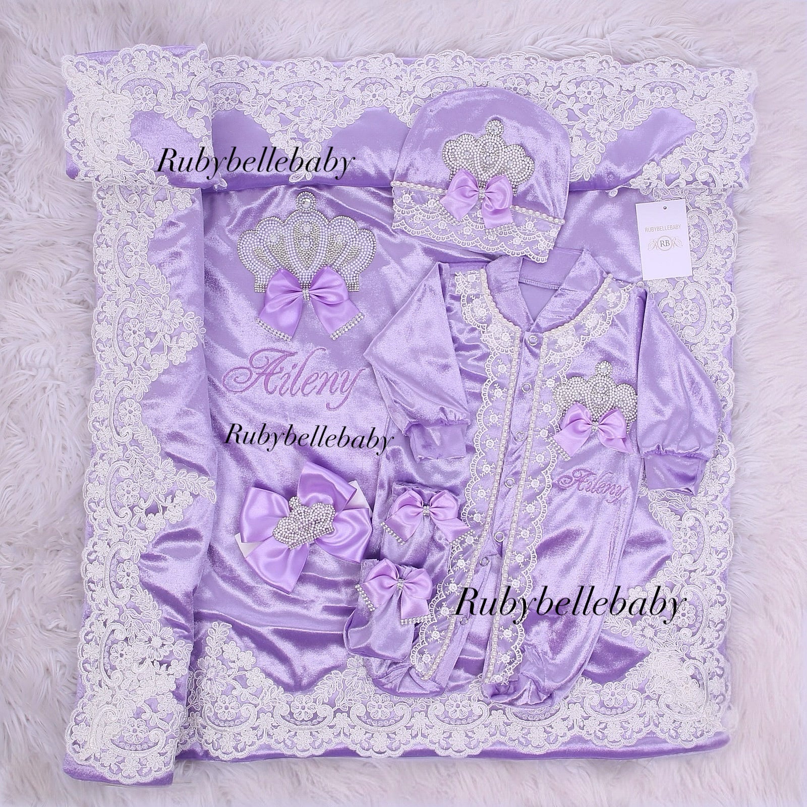 The set includes a personalized footed romper, matching hat, mittens, large satin bow accessory, and a coordinating lace-trimmed blanket — perfect for keeping your little princess cozy while looking picture-perfect. Each piece is finished with satin bows for a luxurious touch, making it ideal for newborn photo shoots, baby shower gifts, and treasured keepsakes.