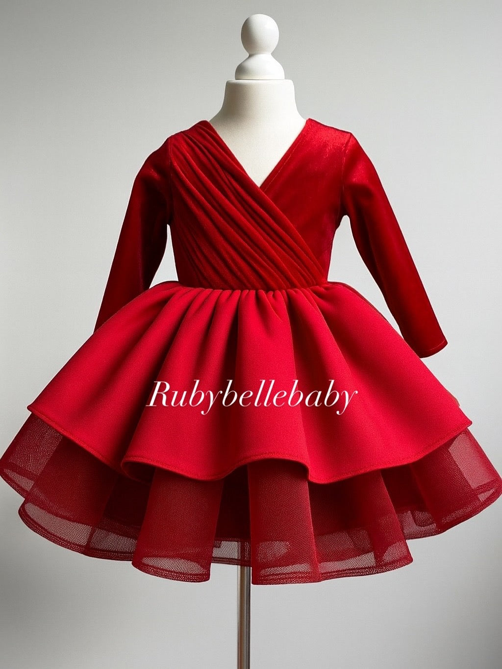 Make every moment magical with our Scarlet Velvet Bow Princess Dress, designed for little girls who love to shine. This luxurious dress features a soft, plush velvet bodice with a flattering wrap-style front, long sleeves for a cozy yet elegant look, and a voluminous layered skirt with tulle for the perfect twirl. The back showcases a statement oversized bow, adding a touch of timeless charm. The dress comes with matching hair accessories and matching shoes for ages (0-12M) only.