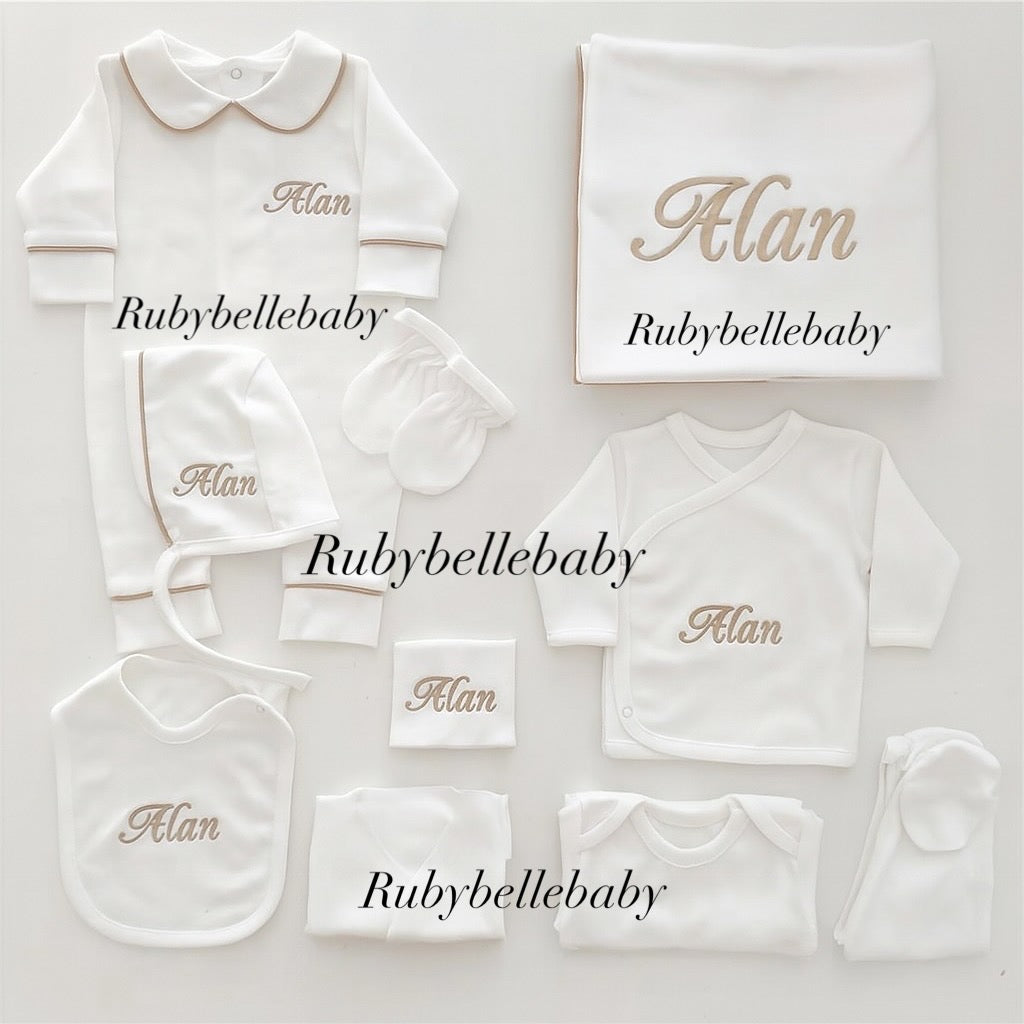 Designed in a soothing white tone with subtle beige piping, this collection brings a touch of understated elegance to your baby’s first wardrobe. Ideal for hospital outfits, first photos, or as a meaningful baby shower gift.