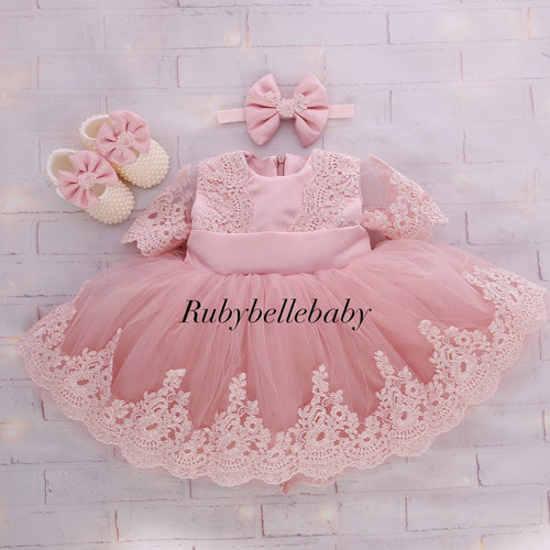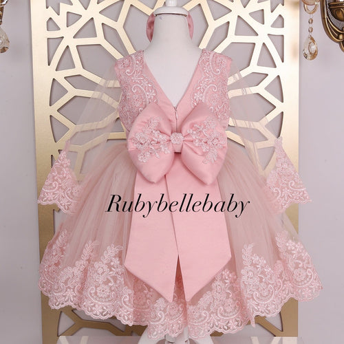 Blush Pink Lace & Tulle Baby Girl Party Dress with Matching Bow – Elegant Birthday, Wedding & Special Occasion Outfit