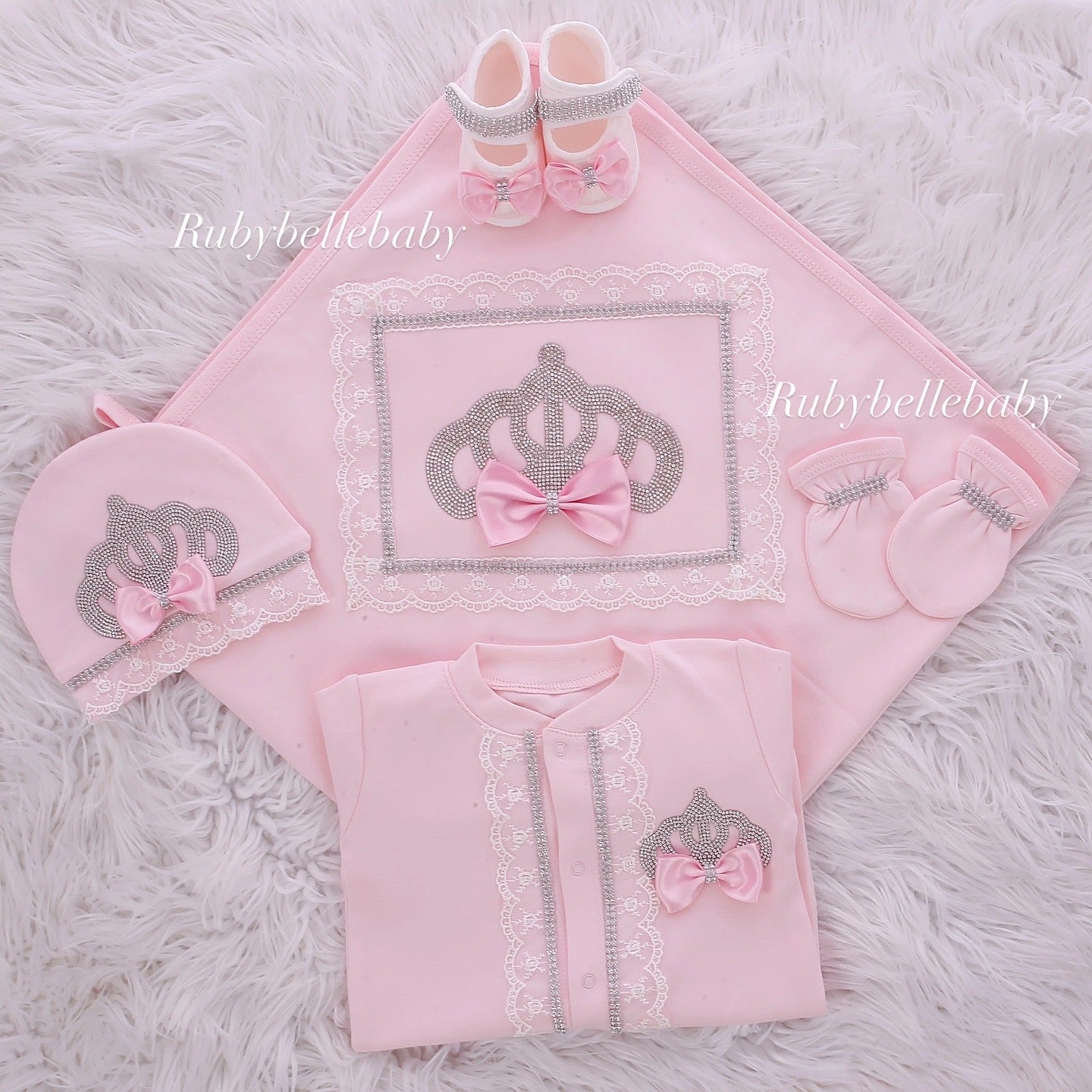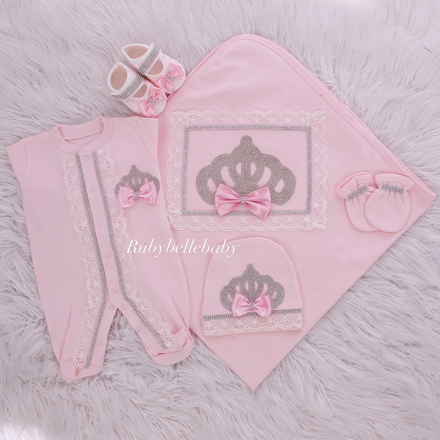 5pcs Luxury Princess Crown Newborn take Me home girls outfit - Pink