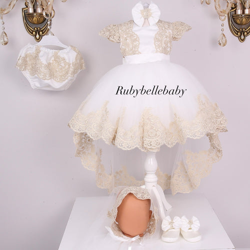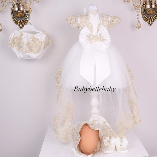 Amilia Lace Girls Long Tail Dress - White/Gold