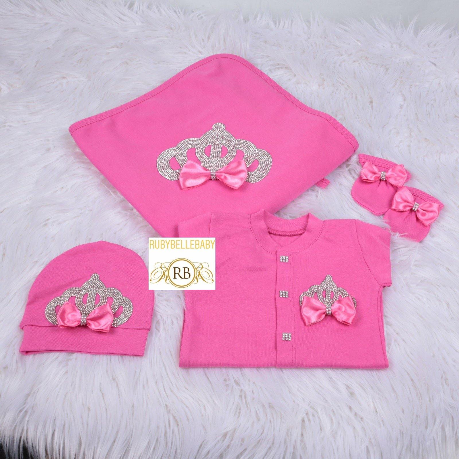 The arrival of your newborn is the most beautiful moment, make it more memorable with our 100% organic cotton handmade set. This set is the most perfect baby shower gift, Christening or home going outfit for your loved baby. It is embellished with high quality rhinestones, pearls,satin etc.