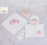 The arrival of your newborn is the most beautiful moment, make it more memorable with our 100% organic cotton handmade set. This set is the most perfect baby shower gift, Christening or home going outfit for your loved baby. It is embellished with high quality rhinestones, pearls,satin etc.