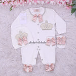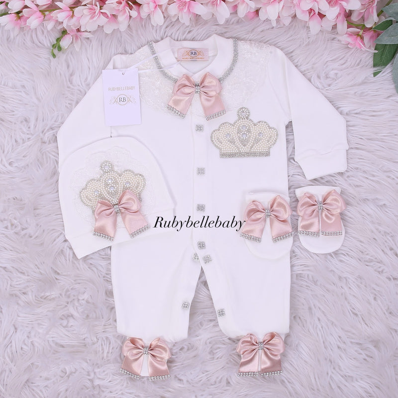 The arrival of your newborn is the most beautiful moment, make it more memorable with our 100% organic cotton handmade set. This set is the most perfect baby shower gift, Christening or home going outfit for your loved baby. It is embellished with high quality rhinestones, pearls,satin etc.