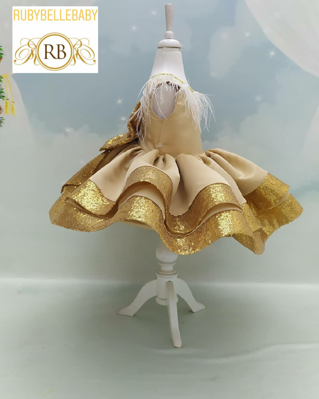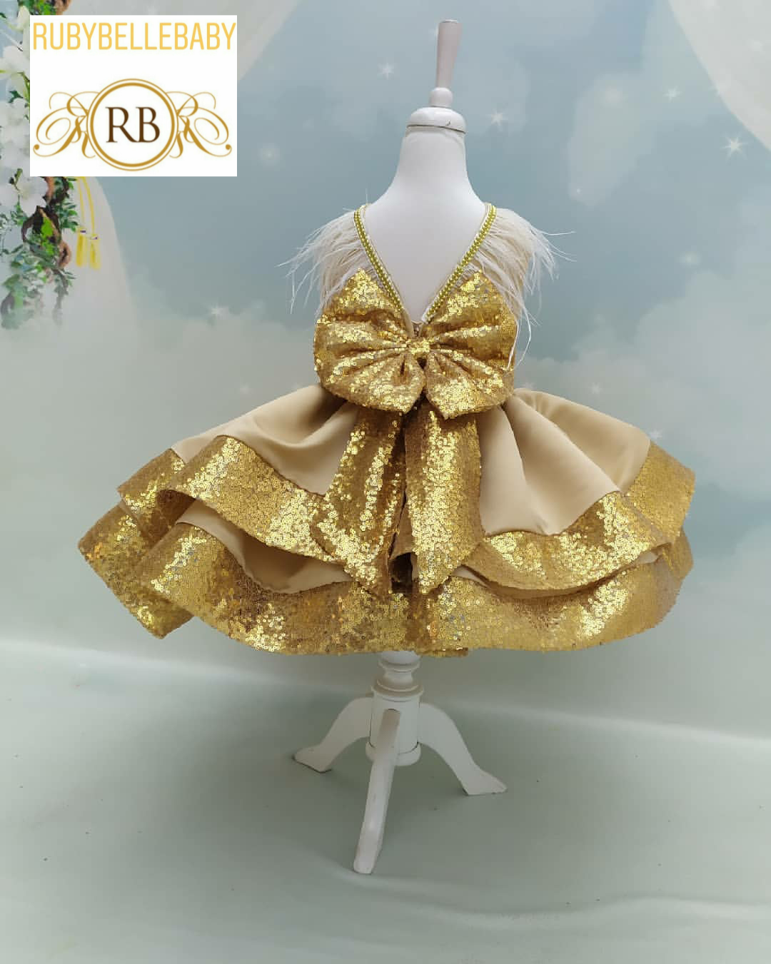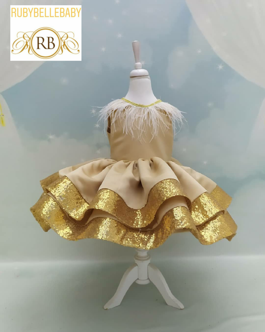 This high fashion dress comes with shoes (0-12M) and hair accessories.