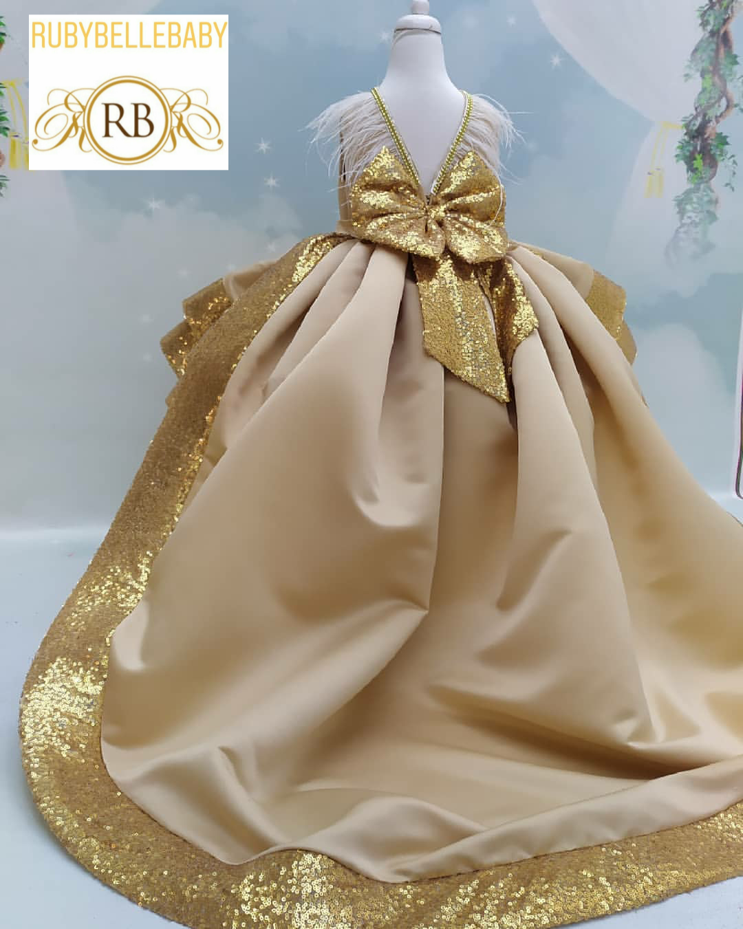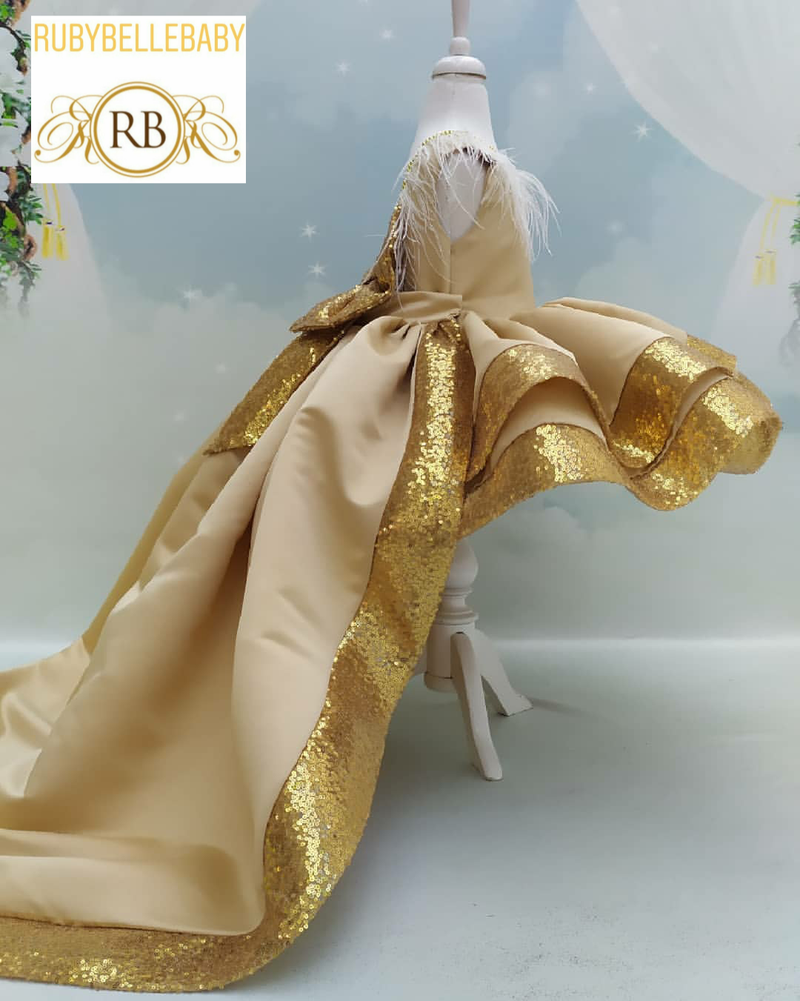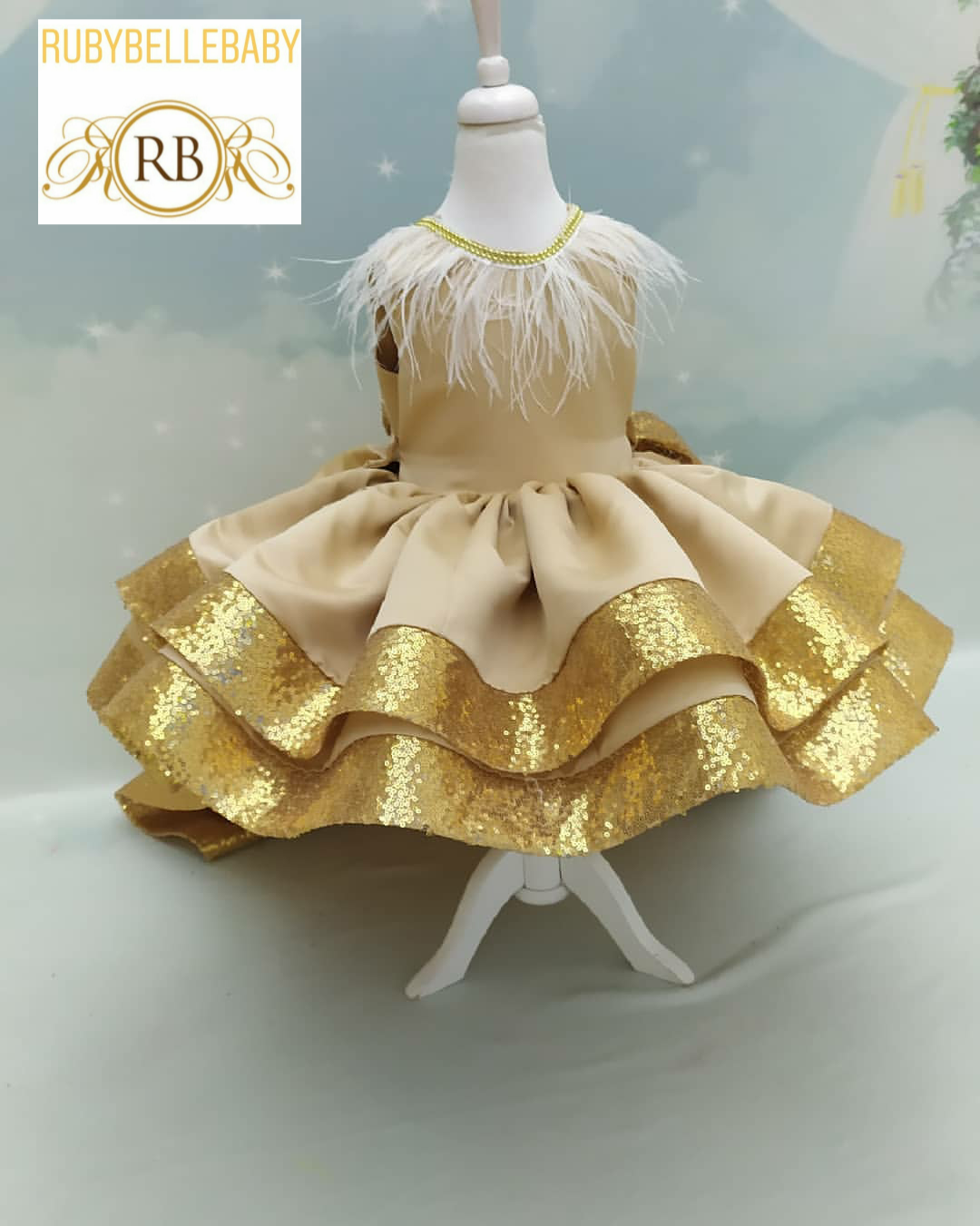 This high fashion dress comes with shoes (0-12M) and hair accessories.