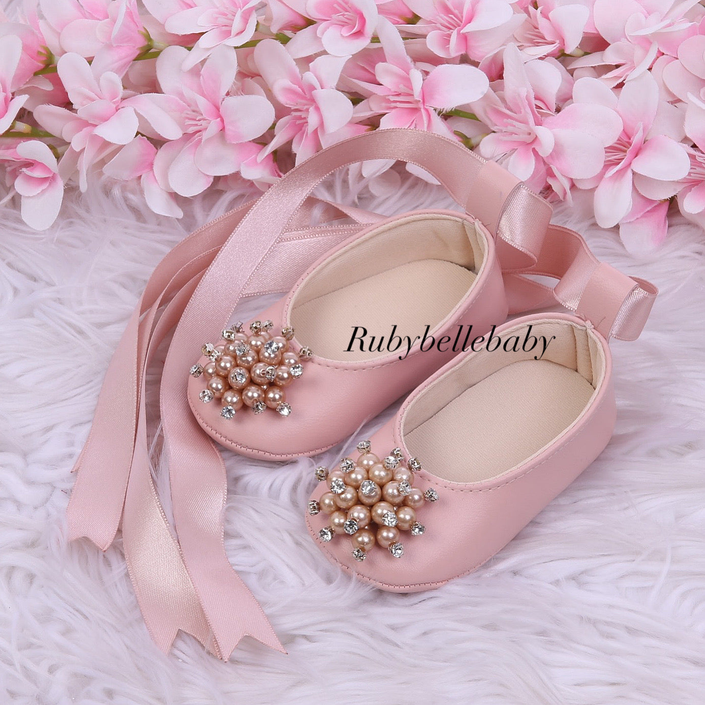 Delicately crafted for life’s most precious moments, the Blush Pearl Bloom Baby Shoes combine timeless elegance with baby-friendly comfort. Made from soft blush pink soft leather, each shoe is adorned with a hand-embellished cluster of luminous pearls and sparkling rhinestones, creating a floral bloom effect that catches the light beautifully.