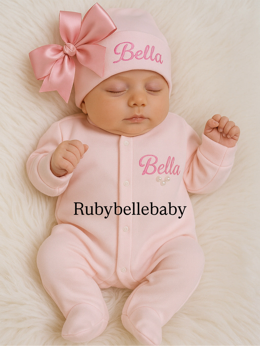 personalized baby outfit, custom baby name romper, baby girl coming home outfit, newborn hospital outfit, personalized hat set, baby shower gift girl, organic cotton baby clothes, pink baby romper, newborn gift set, personalized baby girl set, custom embroidery baby, rubybellebaby outfit, luxury baby gift